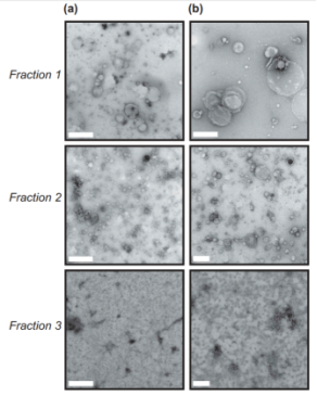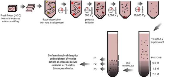 將新鮮冷凍(-80°C)人額葉皮質(zhì)在冰上用剃刀刀片切片,產(chǎn)生1-2cm長、2-3mm寬的切片。冷凍切下的切片組織用75 U/mL 3型膠原酶在Hibernate-E中、37°C條件下消化20分鐘。消化后立即將組織放回冰中,加入蛋白酶和磷酸酶抑制劑。將組織在4℃下以300×g離心5分鐘(沉淀用作腦勻漿+膠原酶對照),將上清液轉(zhuǎn)移至新管中,在4℃下以2000×g離心10分鐘,然后在4℃以10,000×g離心30分鐘。將含有EV的上清液覆蓋在三重蔗糖墊(0.6M,1.3M,2.5M)上并以180,000×g超速離心3小時(shí)分離囊泡。棄去梯度的頂部,收集指定為1,2和3的級分并測量折射率。將每個(gè)級分進(jìn)一步以100,000×g超速離心以沉淀每個(gè)級分中所含的囊泡。每個(gè)樣本均通過包括電子顯微鏡、RNA和蛋白質(zhì)分析在內(nèi)的技術(shù)組合進(jìn)行驗(yàn)證。注意:一些組織樣本不適合這種方法。取樣時(shí)間、儲存時(shí)間和凍融循環(huán)次數(shù)會對組織質(zhì)量產(chǎn)生負(fù)面影響,并導(dǎo)致細(xì)胞碎片和非外泌體囊泡對組分產(chǎn)生污染。