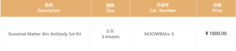 The Exosomal Marker (Alix) Antibody Set Kit provides an economical means to evaluate the presence of exosomal markers. The kit includes enough primary antibody to perform at least 10 western blot experiments for each target. The secondary antibody that is included in this kit has been optimized to enhance the signal-to-noise ratio. We do not recommend using other secondary antibodies with the primary antibodies at this time.