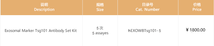 The Exosomal Marker (Tsg101) Antibody Set Kit provides an economical means to evaluate the presence of exosomal markers. The kit includes enough primary antibody to perform at least 10 western blot experiments for each target. The secondary antibody that is included in this kit has been optimized to enhance the signal-to-noise ratio. We do not recommend using other secondary antibodies with the primary antibodies at this time.