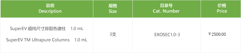 尺寸排阻色譜法(Size Exclusion Chromatography,SEC)被認(rèn)為是從不同樣本中分離和純化細(xì)胞外囊泡(EVs)的最佳方法之一,因?yàn)樗軌蚩焖俣行У貙Vs從復(fù)雜樣本中分離出來,并能保持EVs的原始形狀和生物學(xué)功能。我們開發(fā)了用于分離EVs的不同類型的SEC柱:SuperEV0.5,SuperEV1.0和SuperEV3.0,適合不同樣本和體積的EVs分離。此外,我們還提供SEC柱和濃縮柱的不同組合,既可以從更大體積的細(xì)胞培養(yǎng)上清或尿液中分離EVs,同時(shí)又可以將SEC柱分離的EVs進(jìn)一步濃縮和純化,提供完整的純凈EV的解決方法,適合于EVs的工業(yè)化制備。