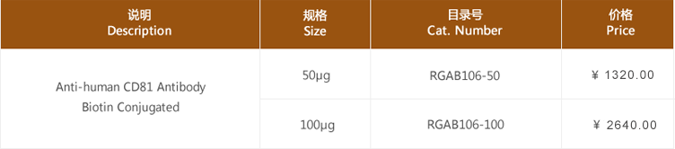 CD81 is a 26 kD non-glycosylated member of the tetraspanin superfamily (TM4SF). CD81 is expressed on T and B cells, NK cells, monocytes, dendritic cells, thymocytes, endothelial cells, and fibroblasts. It also has low levels of expression on granulocytes. CD81 induces B cell adhesion via VLA-4 integrin and has been shown to play a role in early T cell development. CD81 associates with several other cell-surface proteins in a multimolecular complex, including CD19, CD21, CD20, CD37, CD53, and CD82 in B cells, and CD4, CD8, and CD82 in T cells. CD81 is frequently expressed on exosome membranes used to characterize exosome populations from a variety of body fluids.