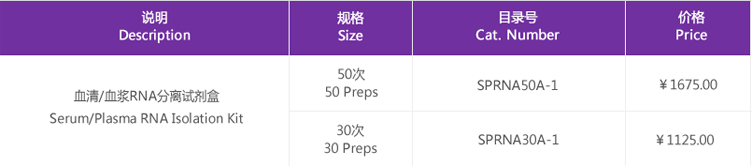 血清或血漿中游離核酸(Free-circulating nucleic acids)通常是小片段( DNA<1000 bp 或 RNA<1000 nt),另外,游離miRNAs可潛在作為疾病(如腫瘤)標志物,用于臨床診斷及用藥指導(dǎo)和病情評估。血清或血漿中游離核酸濃度通常較低,并且不同個體,不同狀態(tài)下含量不同。 血清/血漿RNA分離試劑盒采用酚/胍鹽裂解液提取血清/血漿中總RNA(含有mRNAs和miRNAs,通過特異性結(jié)合核酸的離心吸附柱和獨特的緩沖液系統(tǒng)方便、快捷地純化、洗脫RNA,可直接用于下游應(yīng)用,如realtime RT-PCR,Microarray 基因表達譜,NGS 測序等。