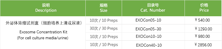 此試劑盒有不同規(guī)格的濃縮柱,一次可處理5ml、10ml或40ml樣本,可達(dá)到20-40倍的外泌體濃縮。此種方法操作簡單,適合常規(guī)實(shí)驗(yàn)室的外泌體研究,有廣泛的下游應(yīng)用,如粒徑分析,核酸提取,Western Blot,ELISA等,也可以進(jìn)一步對外泌體純化,如抗體偶聯(lián)磁珠外泌體捕獲和分離試劑盒(Cat.#EXOMBoCU-xx)或外泌體提取和純化試劑盒(Cat.#EXORGxxCU-1)。