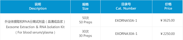 血清或血漿外泌體提取和RNA分離試劑盒是包括外泌體提取和后續(xù)RNA分離、純化。首先,應(yīng)用優(yōu)化的外泌體提取試劑富集血清或血漿中外泌體,然后通過酚/胍鹽方法提取外泌體中總RNA(含有mRNAs和miRNAs),采用吸附柱(Spin Columns)法方便、快捷地純化和洗脫外泌體RNAs,可直接用于下游應(yīng)用,如realtime RT-PCR,Northern Blotting,NGS 測序和microarray等。另外,純化的RNAs是來自外泌體中總RNAs,而不含有血清或血漿中蛋白質(zhì)結(jié)合的RNA(protein-bound circulating RNA)。
