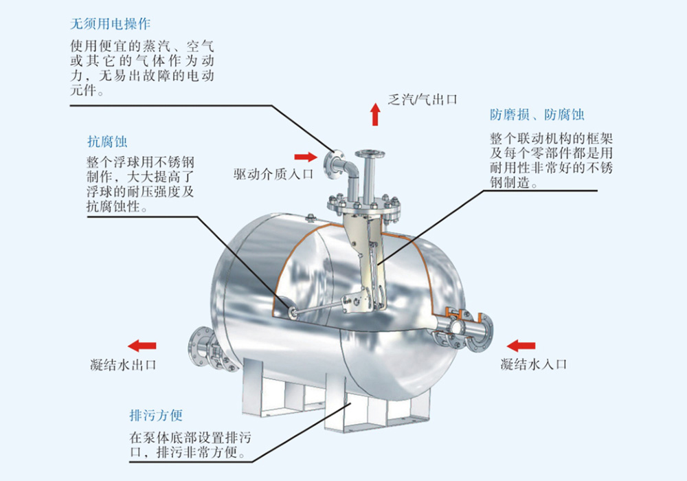汽/氣動力機械泵凝結水回收裝置是一種維護工作少、無須用電操作,使用蒸汽、空氣或其它不燃無毒氣體作為驅動介質的水資源回收設備,可將凝結水或其它液體從較低位置送往較高位置,或從較低壓力或真空送至較高壓力;可用于閉式循環(huán)系統,無蒸汽或閃蒸汽損失,從而把高價值的熱量回收并返回到系統中;還可放置在水淹坑中,無觸電或斷路故障隱患。凝結水的回收溫度高達185℃,高于傳統離心泵100℃的上限,且無密封泄漏、無葉輪磨損或馬達等電氣元件故障問題,減少了停車和維修時間。