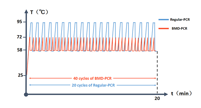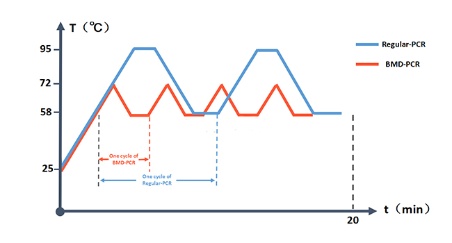 技術原理:通過對引物探針的獨特設計和反應體系的優(yōu)化,使DNA雙鏈在較低的溫度下解鏈,大大減小了延伸溫度和退火溫度的溫度差,進而使PCR反應速度大大加快。