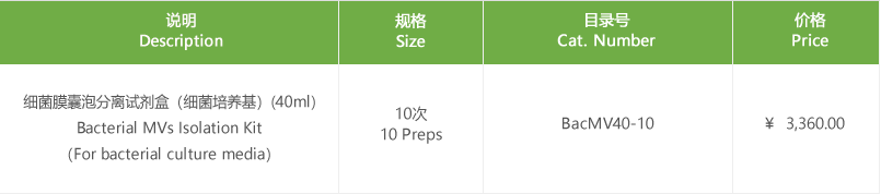 此試劑盒有不同規(guī)格,一次可處理10ml或40ml細菌培養(yǎng)基,操作簡單,適合常規(guī)實驗室的囊泡研究,分離的MVs可用于粒徑分析,核酸提取,Western Blot等。