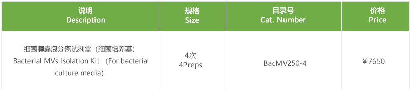此試劑盒有不同規(guī)格,一次可處理10ml、40ml或250ml細菌培養(yǎng)基,操作簡單,適合常規(guī)實驗室的囊泡研究,分離的MVs可用于粒徑分析,核酸提取,Western Blot等。