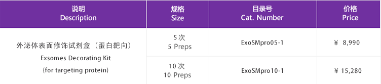 本試劑盒表面修飾效率高,反應(yīng)條件溫和,生理?xiàng)l件下即可發(fā)生反應(yīng),反應(yīng)特異性好,無(wú)有害副產(chǎn)物,不需額外添加催化劑或其他化學(xué)物質(zhì),不會(huì)損傷外泌體膜結(jié)構(gòu),也不影響目標(biāo)蛋白的生物活性和功能,為靶向外泌體提供了一種高效、簡(jiǎn)便的修飾手段,可實(shí)現(xiàn)靶向外泌體的大規(guī)模制備。
