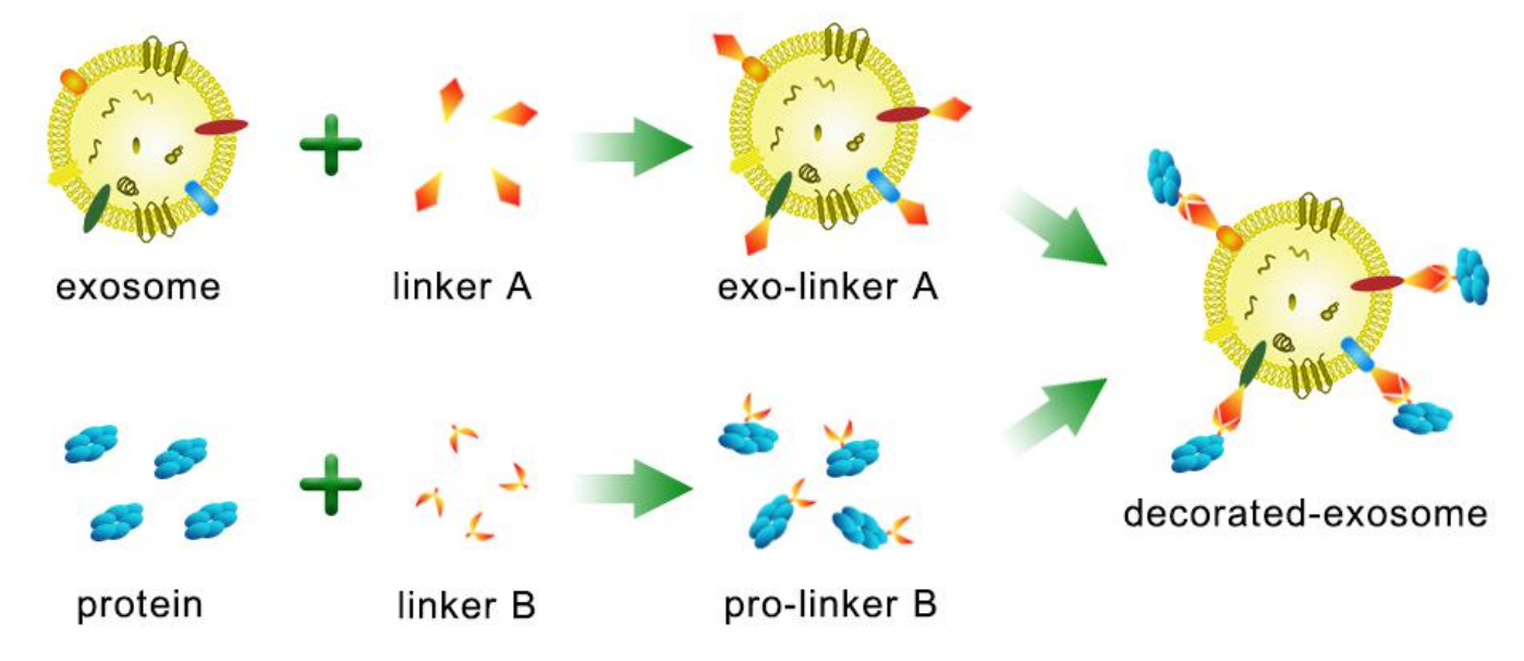 本試劑盒避開繁瑣的基因克隆步驟,通過點(diǎn)擊化學(xué)反應(yīng),直接在提取的外泌體表面修飾目標(biāo)蛋白。首先將點(diǎn)擊化學(xué) linker A 分子共價(jià)偶聯(lián)在外泌體表面,形成 exo-linker A,點(diǎn)擊化學(xué) linker B 分子與靶向蛋白共價(jià)偶聯(lián),形成 pro-linkerB,各自純化,去除剩余的 linker 分子。然后將 exo-linker A 和 pro-linker B 孵育,兩個(gè) linker 之間發(fā)生快速高效的點(diǎn)擊化學(xué)反應(yīng),以共價(jià)鍵形式將目標(biāo)蛋白偶聯(lián)在外泌體表面,最后采用 SEC 分子排阻柱將剩余的 pro-linker B去除,得到大量純凈的修飾外泌體。